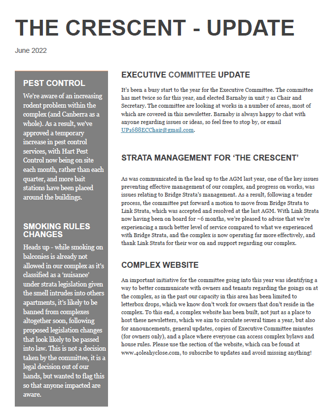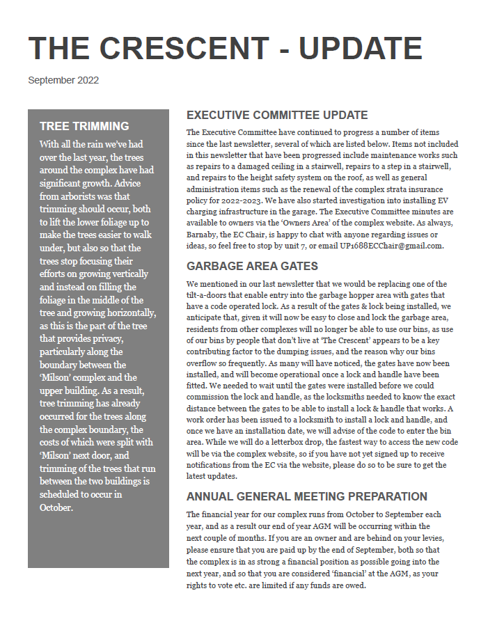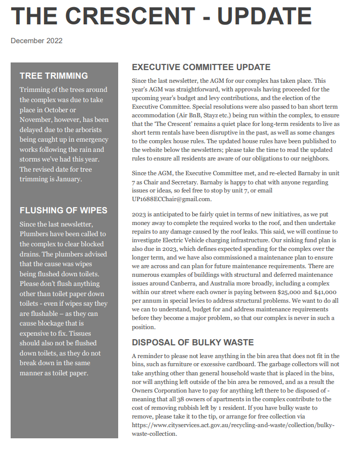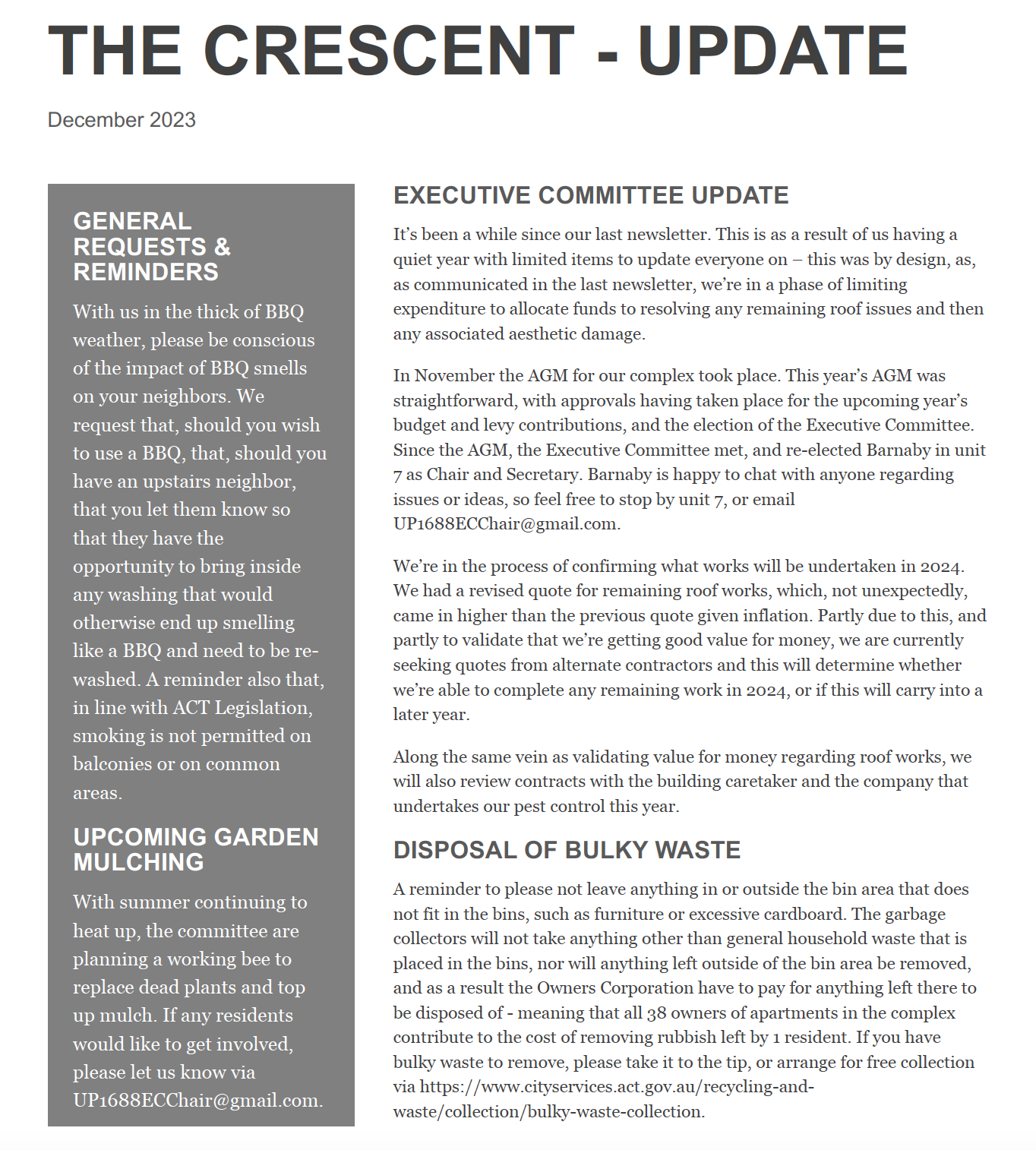 A reminder as well to please not leave anything in the bin area that does not fit in the bins, such as furniture or excessive cardboard. The garbage collectors will not take anything other than general household waste that is placed in the bins, and as a result the Owners Corporation have to pay for anything left there to be removed - meaning that all 38 owners of apartments in the complex contribute to the cost of removing rubbish left by 1 resident. If you have bulky waste to remove, please take it to the tip, or arrange for a collection via https://www.cityservices.act.gov.au/recycling-and-waste/collection/bulky-waste-collection.