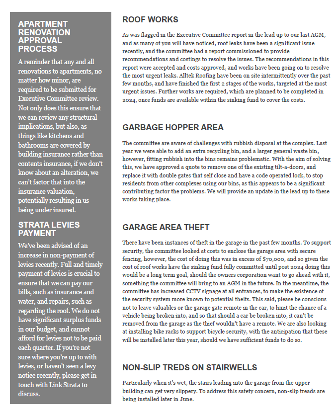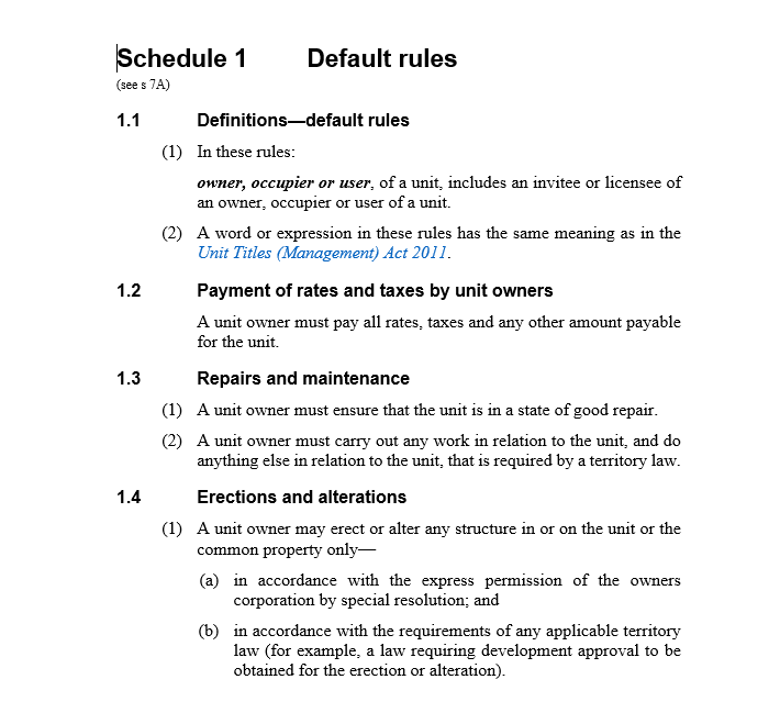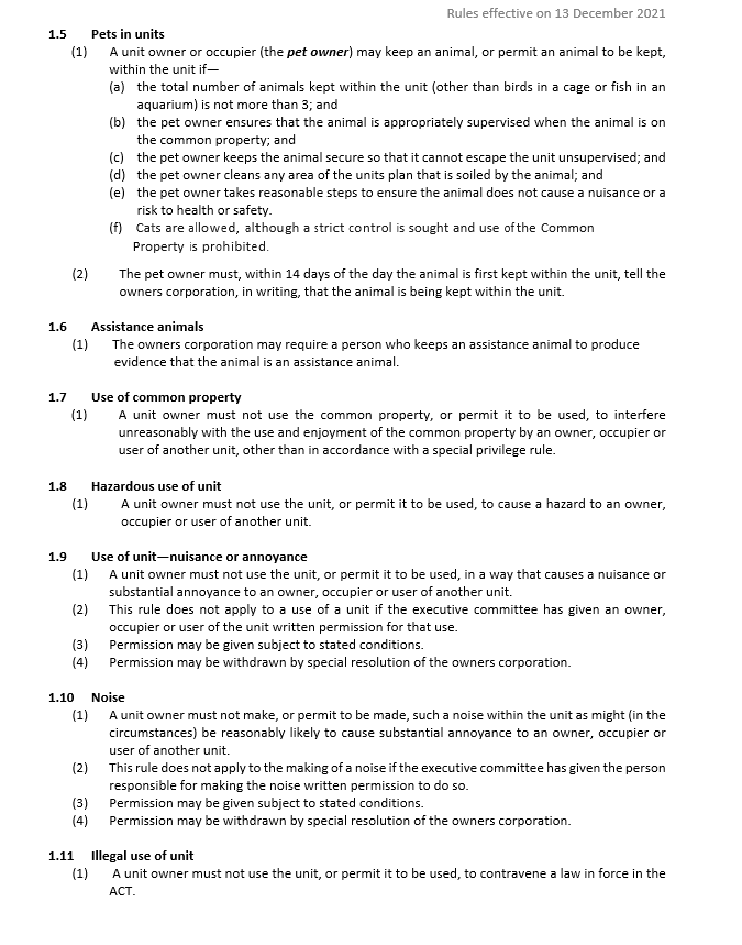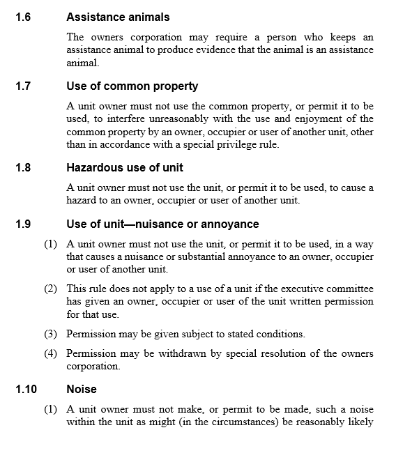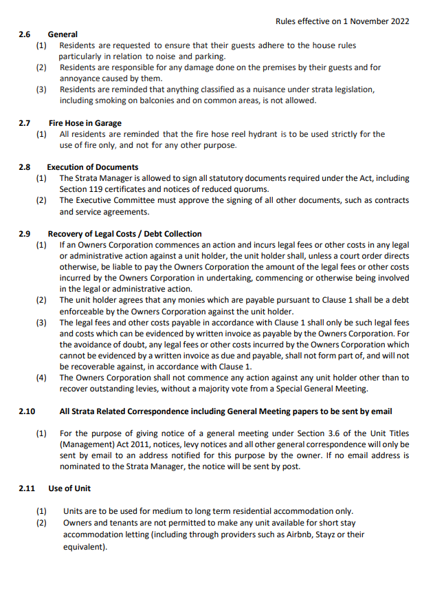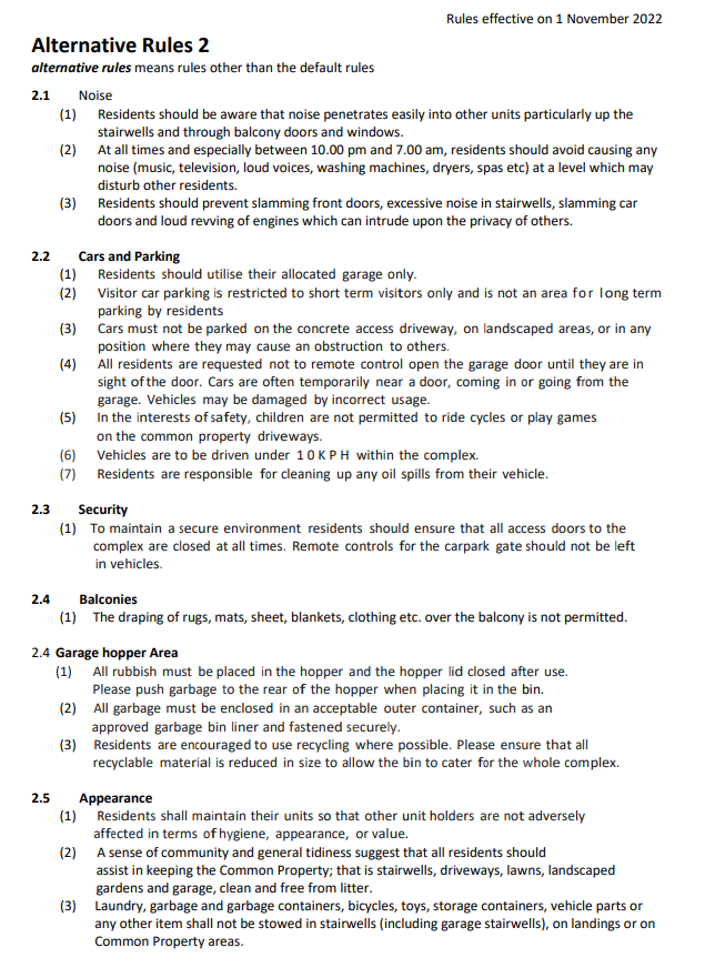 As is the case with all apartment complexes in Australia, there are a set of by-laws and house rules that underpin how our complex operates. For the general well-being of the residents and to ensure that all enjoy a maximum of convenience, comfort and privacy, it is necessary to have some rules. These rules are intended to keep annoyance to a minimum and to provide guidelines for residents and their guests, and it’s important that everyone that lives in the complex are aware of these. You can find copies of our by-laws and house rules below.